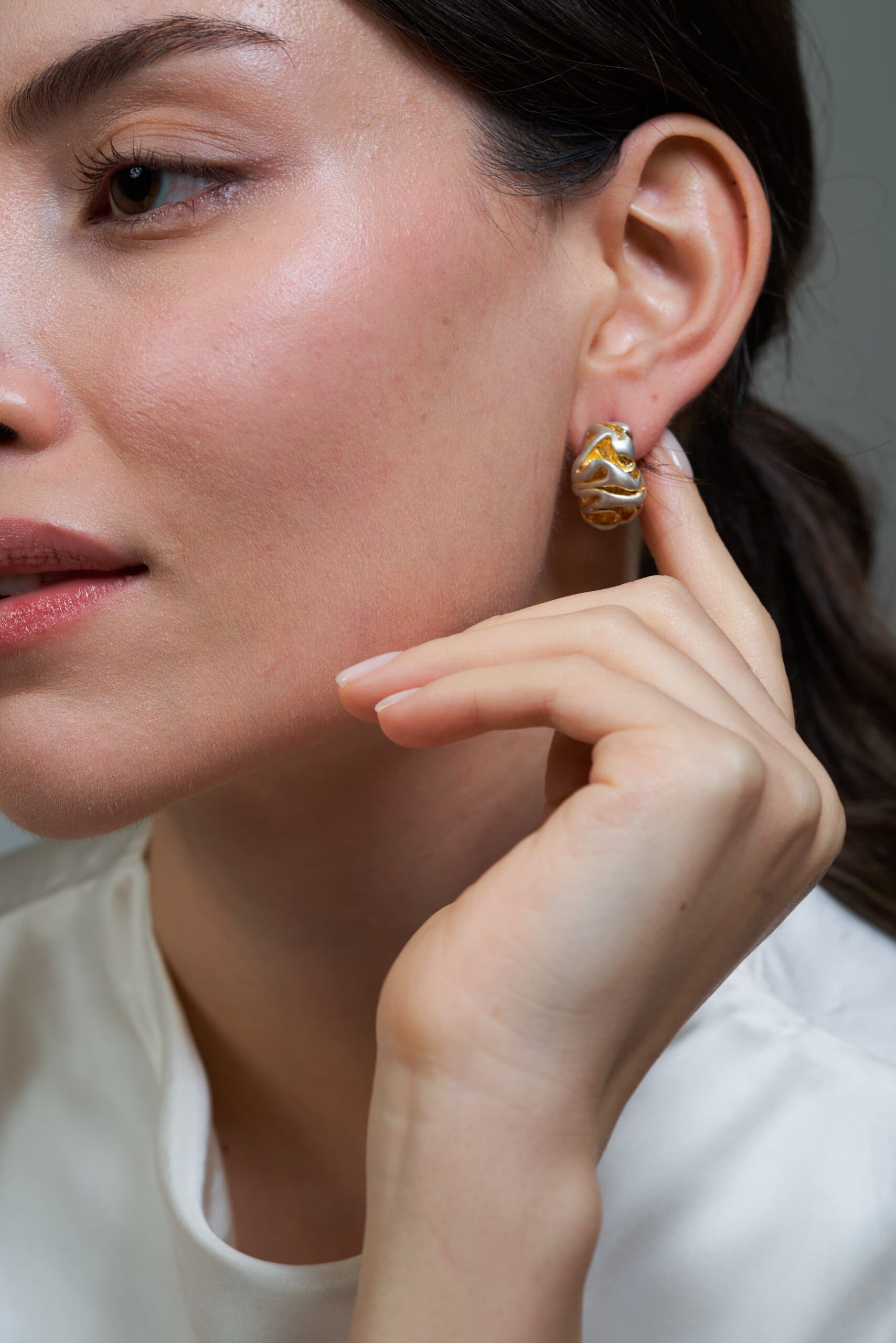 Handcrafted from 925 sterling silver and finished with 18k gold plating, these earrings feature an organic, sculptural structure shaped through traditional wax carving techniques. Soft curves and flowing volumes reflect the natural rhythm of molten matter as it cools and solidifies.